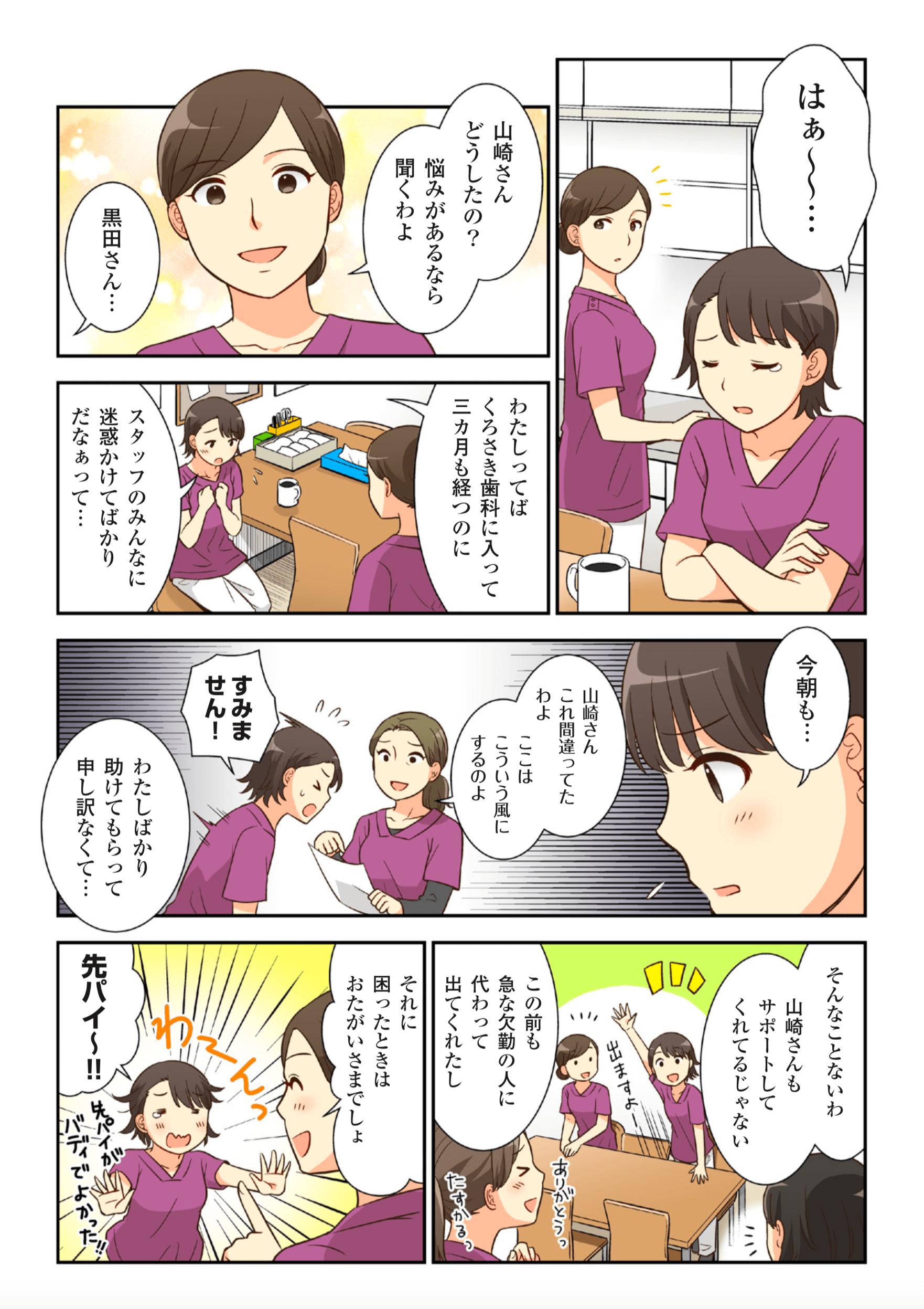 子供が小さかったので週1でも勤務可能な就職先を探していたところ当医院に入職しました。 今はとても優しいのですが、入職当時は院長が厳しかった・・・。< また入職したとき常勤は全員自分より年下だったので、何もできない自分に教えてくれるか不安でした。 最初は先輩を見ながら、マニュアルもあったので助かりました。現在はフルタイム、主任として勤務しています。 セミナー参加費用を医院で負担して頂きながら勉強できるのもありがたいです。 医療人は常に勉強し続けなければいけないということを、くろさき歯科で教えてもらいました。