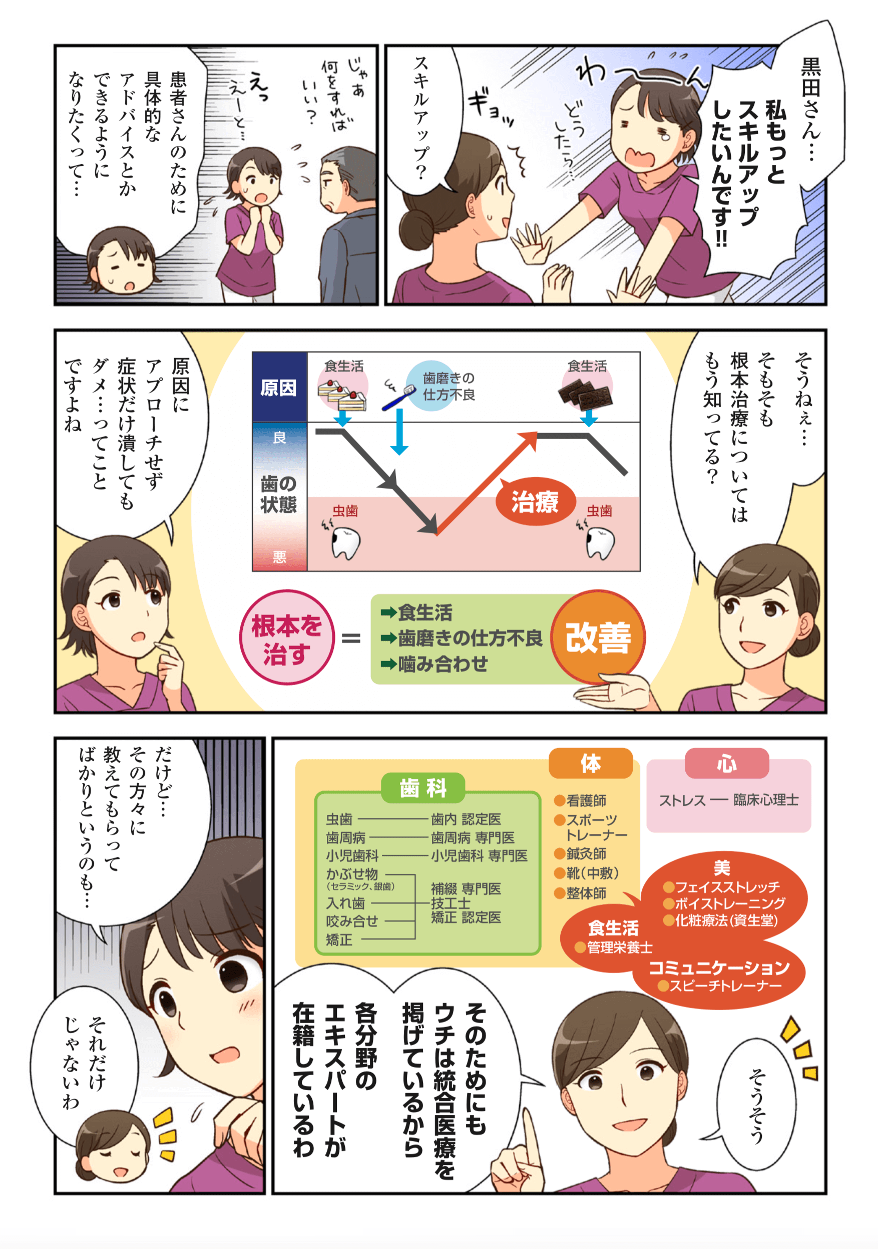 先輩スタッフの技術を吸収し、各専門医(歯周・小児・補綴・矯正)の下、幅広い知識・高度なスキルが身につきます。